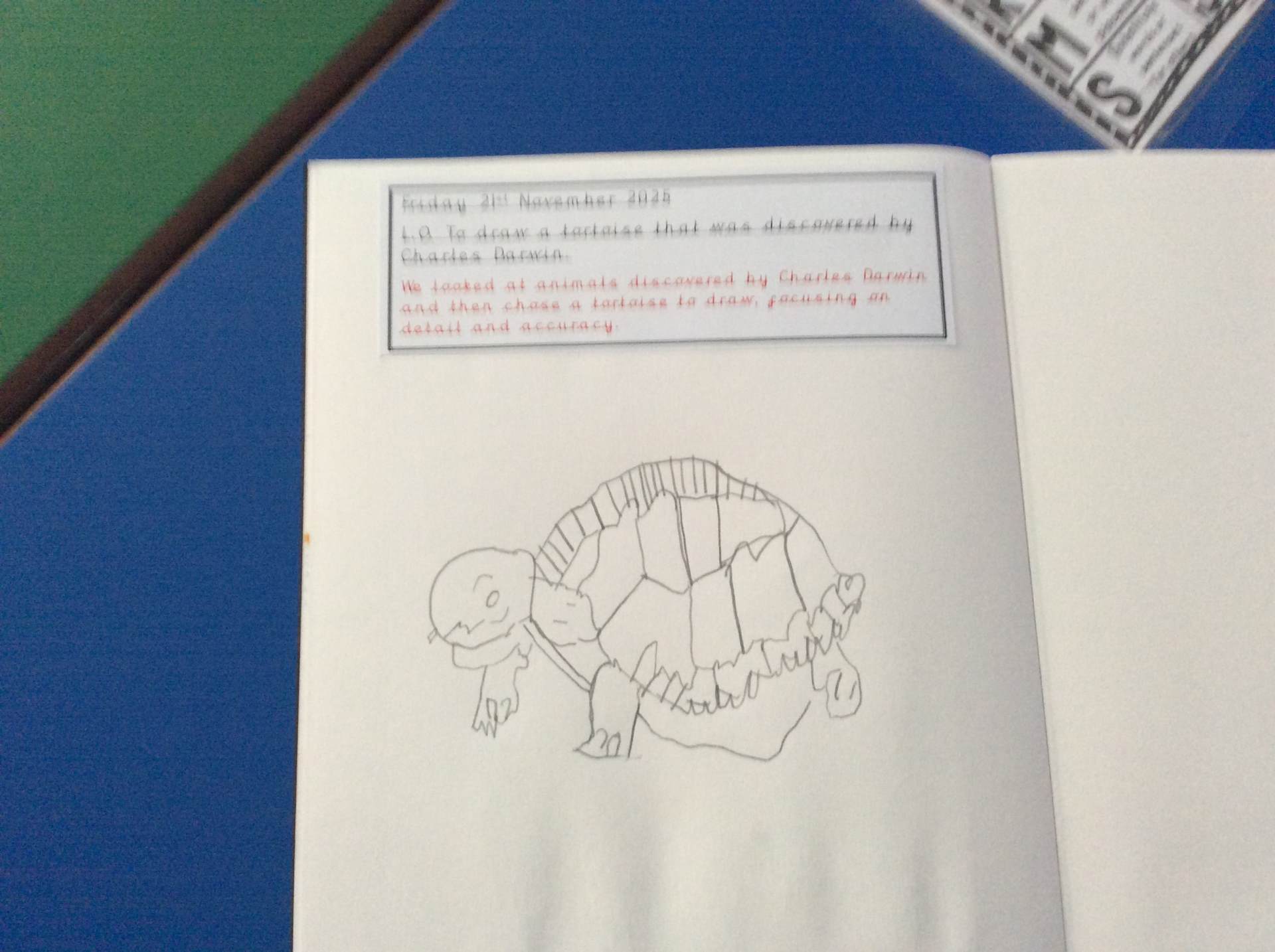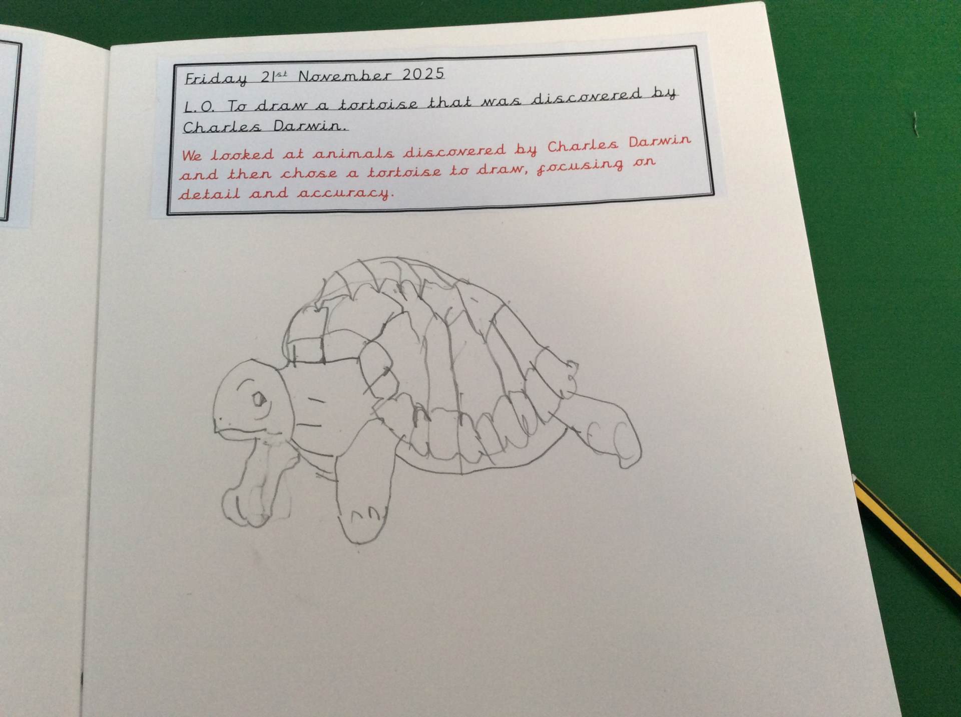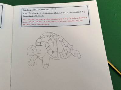 On Friday, in Art, the children learned how to draw a tortoise inspired by the species discovered on the Galápagos Islands by Charles Darwin. They carefully studied its features and created some wonderful artwork.